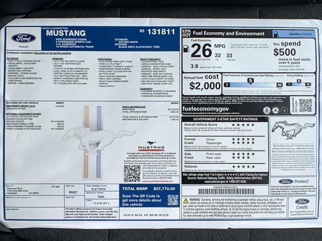 2025 Ford Mustang EcoBoost 2D Coupe RWD EcoBoost 2.3L I4 GTDi DOHC Turbocharged VCT 10-Speed Automatic21/32 City/Highway MPG