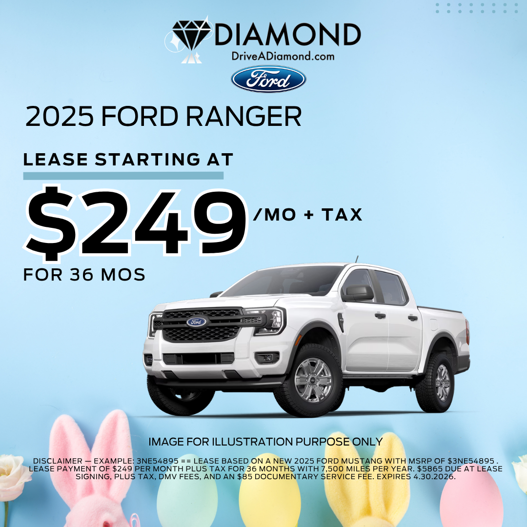 DISCLAIMER — Example: 3NE54895 == Lease based on a New 2025 FORD RANGER WITH MSRP OF $36,055. Lease payment of $249 per month plus tax for 36 months with 7,500 miles per year. $5865 due at lease signing, plus tax, DMV fees, and an $85 documentary service fee. Expires 4.30.2026.