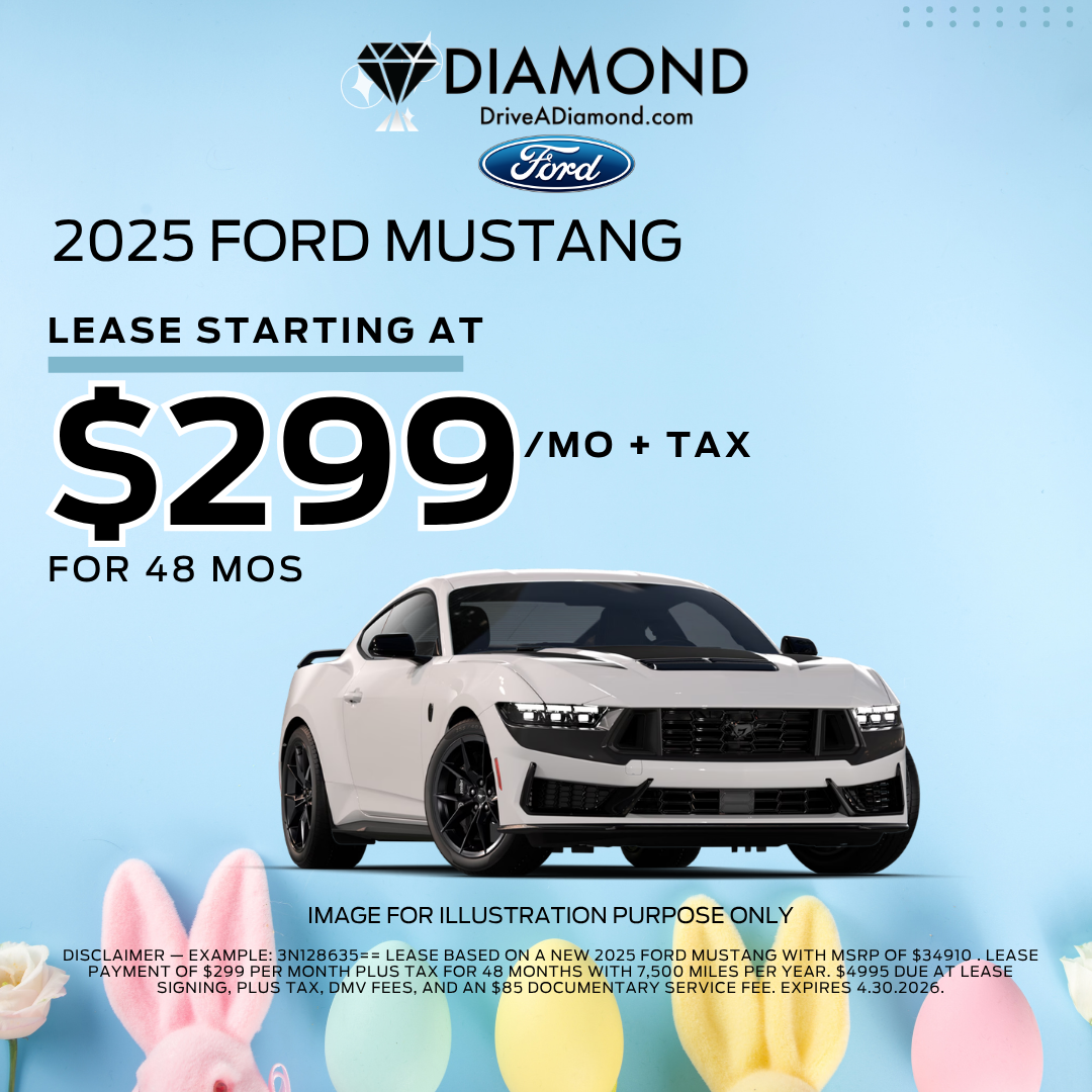 DISCLAIMER — Example: 3N128635== Lease based on a New 2025 FORD MUSTANG WITH MSRP OF $34910 . Lease payment of $299 per month plus tax for 48 months with 7,500 miles per year. $4995 due at lease signing, plus tax, DMV fees, and an $85 documentary service fee. Expires 4.30.2026.